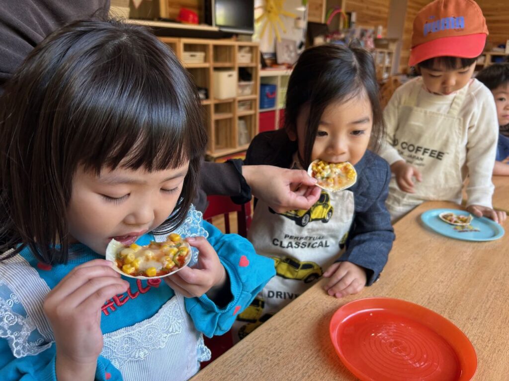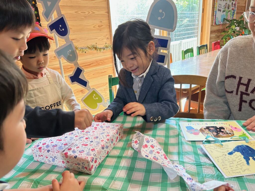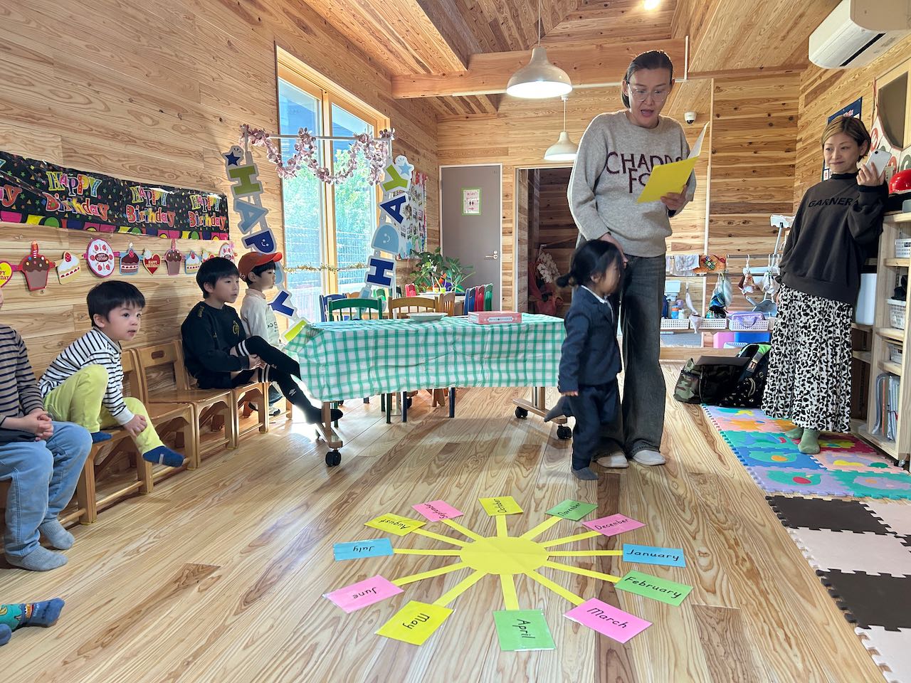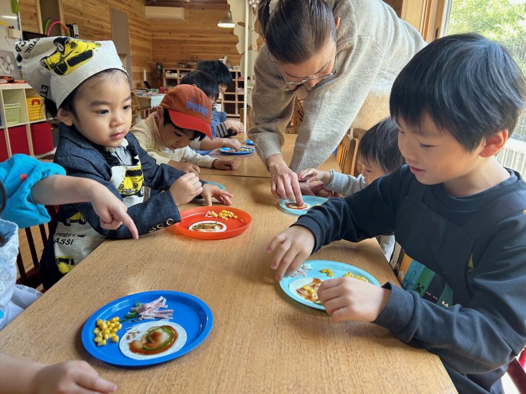 今日は11月生まれのお友だちの誕生日会をしました。歌をうたったり、インタビューしたり、生まれてから今までの成長の写真を見たり、お家の人からお話を聞いたりしてお祝いしました。その後、ミニピザを作って美味しくいただきました!