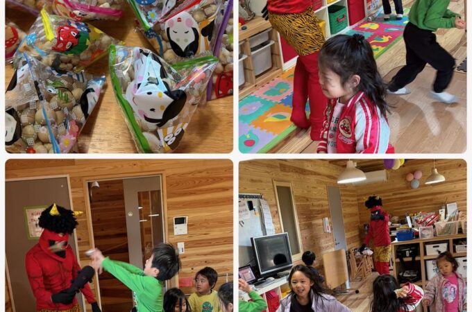 今日は節分。スクールに赤鬼が来ました!もっていた豆をぶつけて「Demons out! Good luck in! (おには~そと、...